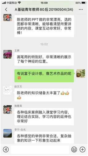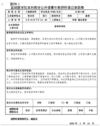 组织全院青年教师进行了观摩,并通过微信群,实时讨论课程的特色和优缺点,通过学习讨论不断提高青年教师的在线教学水平。课后,91国产自拍又组织老师填写听课记录表,总结听课的收获,及对公开课的建议等。疫情未除,战线各异,我们一直在努力!