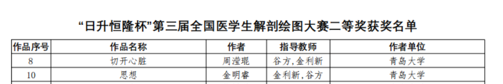 金利新教授和谷方教授指导的金明睿同学的作品“思想”和周滢琨同学的作品“切开心脏”获得三届全国医学生解剖绘图大赛二等奖。