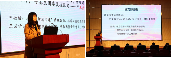 辅导员谭雪梅老师主持。谭雪梅首先带领大家认真学习了学校关于团支部“对标定级”、智慧团建、青年大学习及青鸟计划等工作的相关要求,特别强调了团支部“对标定级”中的“三必核、三必听”的考核标准,敦促各支部积极查找问题,不断改进工作。