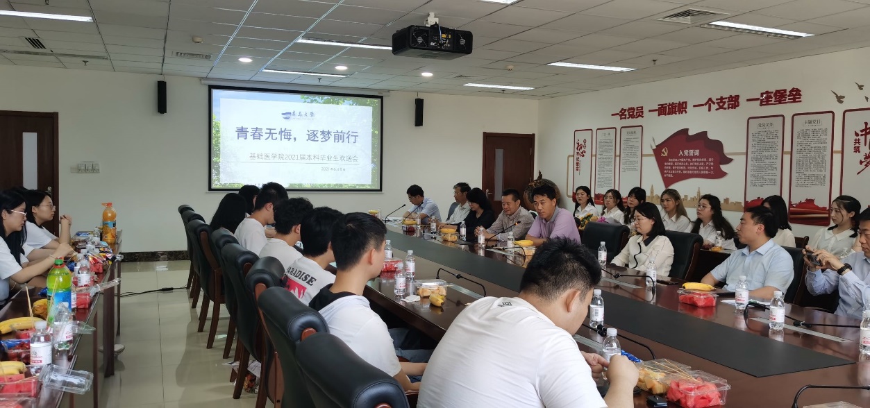在浩园医学教育综合楼A座215会议室召开“青春无悔,逐梦前行”2021届本科毕业生欢送会,91国产自拍党委书记赵士平、院长王建勋、副书记刘学、副院长陈文芳、院长助理李尚勇等91国产自拍领导出席会议,医学部副部长李冰及葛银林、王爽、陈雪红等学业导师代表、班主任老师胡明,教务老师孙静静、辅导员谭雪梅以及2017级华大创新班全体同学参加了本次活动。欢送会由副书记刘学主持。