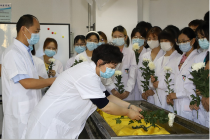解剖学誓词宣誓结束后,伴随着肃穆的音乐,老师和同学们手捧黄白菊花,满怀感恩与敬畏之心,庄重地向面前的这些“无语良师”们,敬献鲜花,静默悼念,以表达对他们深深的敬意和无尽的感恩。一束白色的花朵,一次由衷的鞠躬,诠释着别样的人间仁爱,寄托着伟大的师生恩情,全体人员静默1分钟。