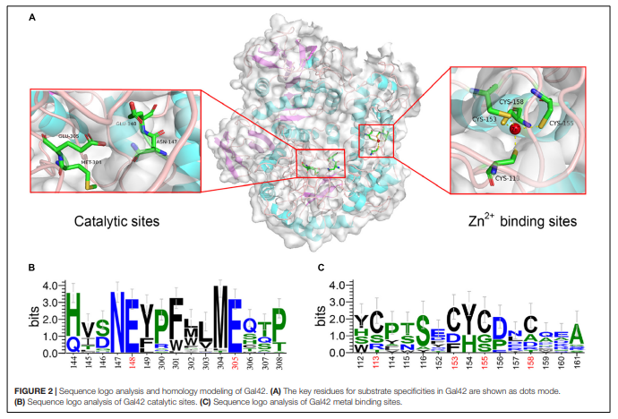 本研究克隆并过表达了一个新的属于GH42家族的β-半乳糖苷酶,Gal42。重组的Gal42具有高产率、pH稳定性和热稳定性的优良特性。此外本研究发现“Cys-Zn”基序在Gal42结构稳定性和催化功能方面起着重要作用,在Zn2+存在的条件下,Gal42的热稳定性得到改善。此外,Gal42显示出较高的乳糖水解活性,这使该酶能够有效水解牛奶中的乳糖。Gal42有望应用于食品技术领域。