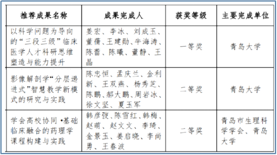 申报的3项成果获奖。其中,姜宏教授组织申报的《以科学问题为导向的“三段三级”临床医学人才科研思维塑造与能力提升》获一等奖;陈忠恒教授组织申报的《影像解剖学“分层递进式”智慧教学新模式的研究与实践》、韩彦弢教授组织申报的《学会高校协同·基础临床融合的药理学课程构建与实践》分获二等奖。