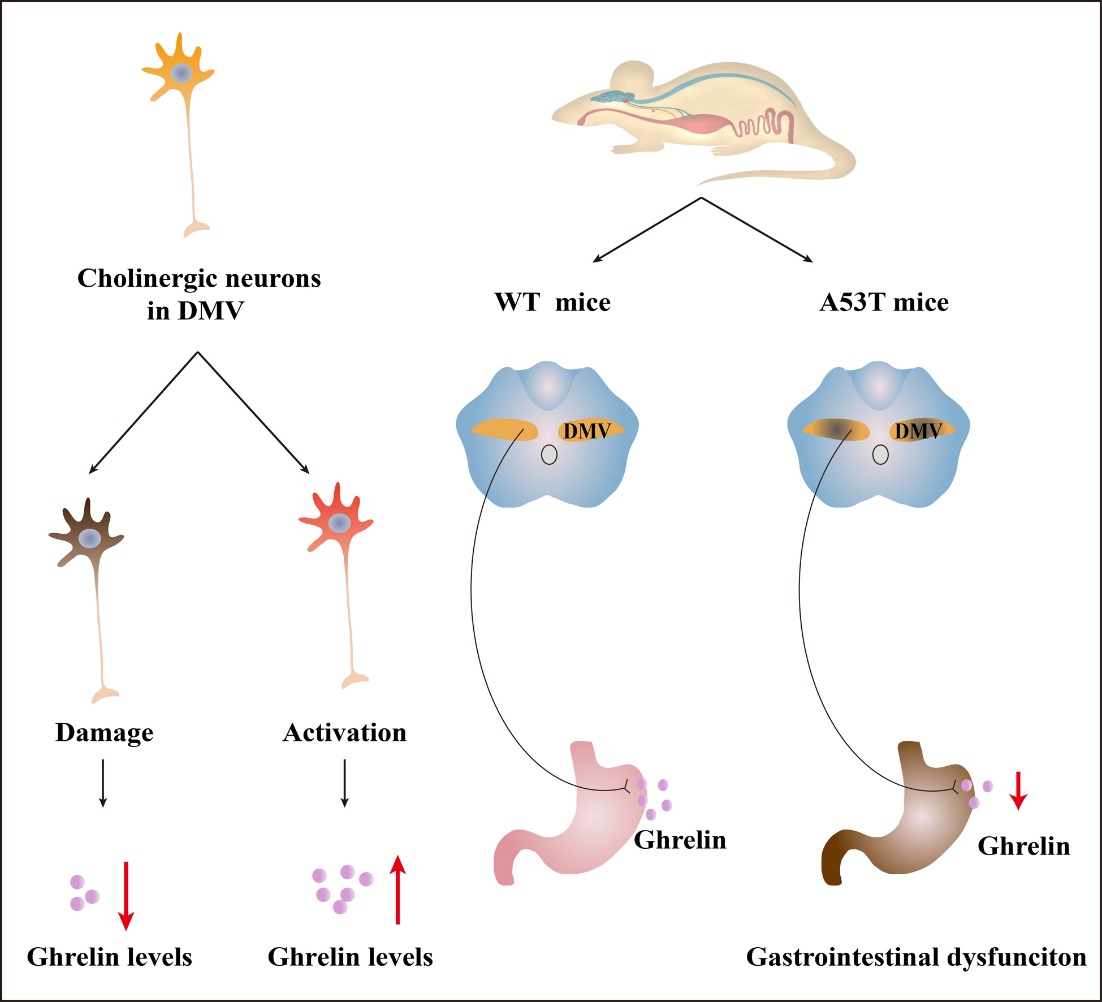 姜宏教授研究团队在前期研究已发现,在帕金森病患者和动物模型中血浆ghrelin水平下降和胃肠功能障碍,但具体机制不明。研究小组在帕金森病转基因小鼠病程的早期阶段,观察到DMV胆碱能神经元丢失。为证实其与血浆ghrelin水平变化的关系,研究小组利用mu p75-SAP立体定位注射,选择性损伤DMV胆碱能神经元,发现血浆ghrelin水平降低。而应用化学遗传学方法,选择性激活DMV胆碱能神经元可导致血浆ghrelin水平升高。胆碱能神经元受损后,出现胃肠道功能紊乱,大便湿重和干重下降,小肠推进率和胃排空率下降,而经微型渗透压泵皮下持续给予外源性ghrelin,可部分改善转基因帕金森病小鼠的胃肠道功能障碍。利用伪狂犬病毒逆行示踪法,他们发现了存在从胃底到DMV的神经纤维投射。该研究揭示了帕金森病病程早期血浆ghrelin水平的降低可能与脑干迷走神经背核(DMV)胆碱能神经元损伤有关,从而将帕金森病的中枢神经系统退行性变与胃肠道功能障碍联系起来。这项研究表明,血浆ghrelin水平可能作为帕金森病中反映DMV病变的一个外周指标,为最终将ghrelin开发成为一种新型帕金森病早期诊断生物标记物奠定基础,从而为反映帕金森病中枢病理改变提供简便可行的临床检测手段。