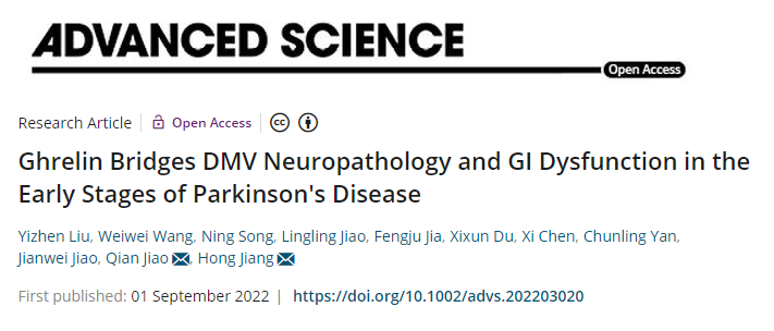 姜宏教授团队于《Advanced Science》(中科院期刊分区1区,IF=17.521)在线发表了题为Ghrelin bridges DMV neuropathology and GI dysfunction in the early stages of Parkinson's disease的研究成果。该研究得到了国家自然科学基金委、山东省自然科学基金委、山东省科技厅和泰山学者工程等的资助。91国产自拍